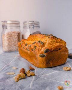5. Colocar o preparado anterior numa forma de pão (previamente untada/pincelada com azeite e farinha), colocar por cima as sementes de abóbora e levar ao forno pré-aquecido durante cerca de 30 minutos ou até estar cozinhado.