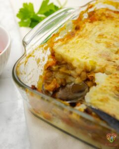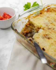 6. Num tabuleiro de ir ao forno, colocar uma camada de puré de batata no fundo. De seguida, colocar uma camada de «recheio» (lentilhas estufadas com os hortícolas), e outra de puré. Levar ao forno pré-aquecido a 180ºC até alourar (cerca de 20 minutos).