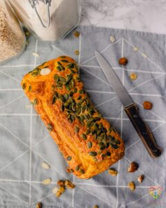 - Colocar o preparado anterior numa forma de pão (previamente untada/pincelada com azeite e farinha), colocar por cima as sementes de abóbora e levar ao forno pré-aquecido durante cerca de 30 minutos ou até estar cozinhado.